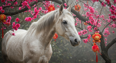 White horse stands under blooming cherry blossom branches decorated with festive red lantern ornaments in spring garden.