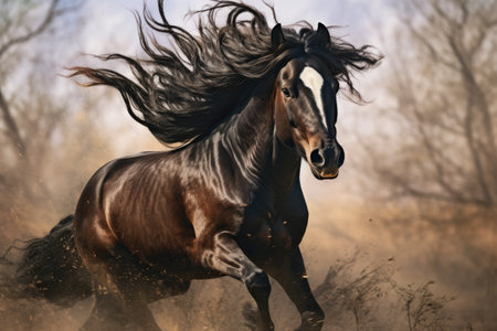 a horse galloping in dust, captured in the style of iconic imagery. the vray tracing enhances the brown and amber tones, creating a photo-realistic portrayal of the horse's unpredictable and lively movement. the wide angle lens adds depth and perspective to this captivating scene. ai generated