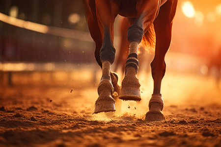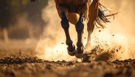 Dynamic close-up capturing powerful horse legs in action, stirring up earthy dust as they surge forward in a competitive race.
