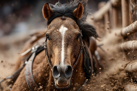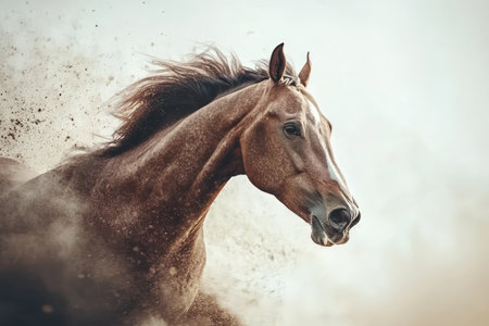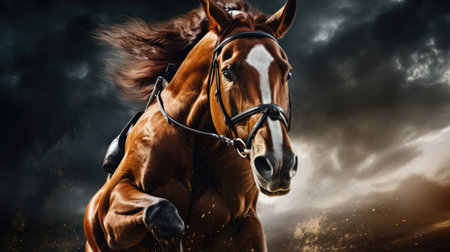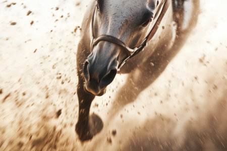 Powerful motion captured as a horse gallops with intensity on a dusty race track. the scene conveys speed, determination, and the raw energy of competitive horse racing, the animal's focused expression and athleticism. Generative AI