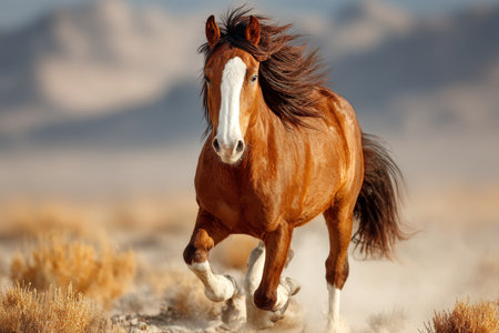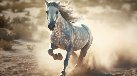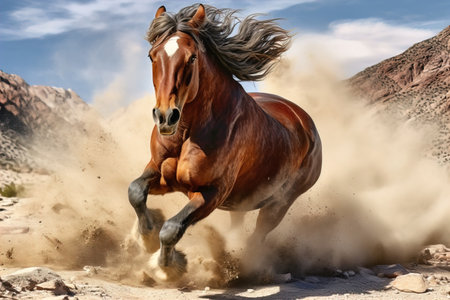 Brown horse running fast on sandy desert with dust flying, powerful animal in motion under clear sky, wild energy and freedom