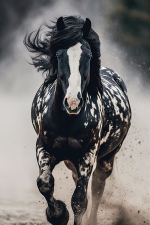 A wild mustang. The powerful spotted horse gallops with his mane fluttering and sweeps up clubs of sand and earth. Generative AI.