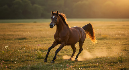 A powerful brown horse gallops through a sunlit meadow, its mane flowing in the gentle breeze. The vibrant nature surrounding it adds to the beauty of the scene.