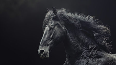 A stunning close-up of a black horse showcasing its flowing mane and expressive eyes. The portrait captures the beauty, strength, and grace of this majestic animal in a serene outdoor setting.