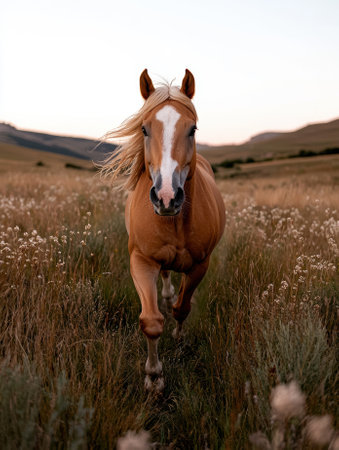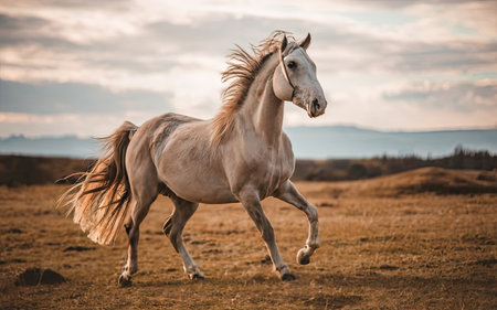 A stunning horse in motion, galloping gracefully across golden grasslands with soft mountains in the background, capturing the essence of freedom and nature.