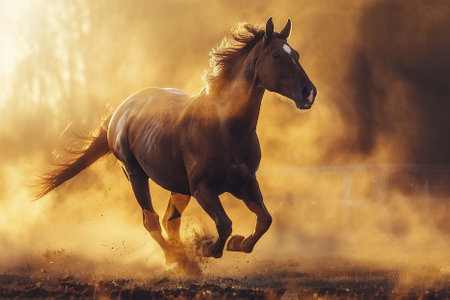 A magnificent horse gallops through a dusty landscape, kicking up clouds of dust against a beautiful sunset backdrop. The scene captures freedom and wild beauty.