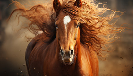 a close-up of a wild horse mid-gallop, mane flowing in the wind, created with generative ai