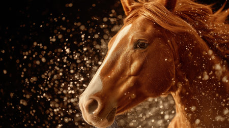 A beautiful portrait of a brown horse with flowing mane surrounded by sparkling water droplets, capturing the essence of equine beauty and power.