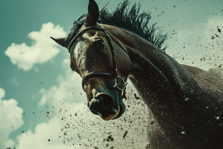 Close-Up of a Horse's Head and Mane in Motion. Concept of Equestrian Beauty, Animal Strength, Nature, Gallop, Fast Speed, Beauty in Motion, Freeze Frame.