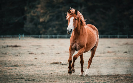 Beautiful red horse running in the paddock in autumn time.