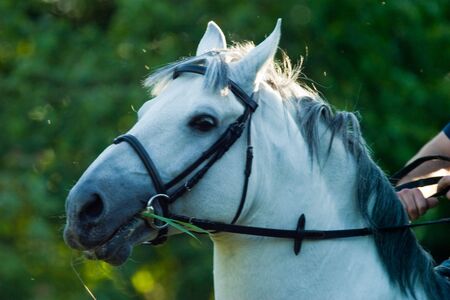 Portrait of beautiful white Arabian stallion with long mane