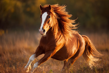 A beautiful bay horse is galloping in the sunset sunlight, AI Generated illustration