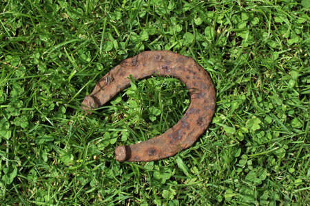 Rusty horseshoe in the green grass