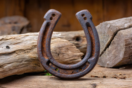 A horseshoe is placed on a textured wooden surface, reflecting tradition and fortune.