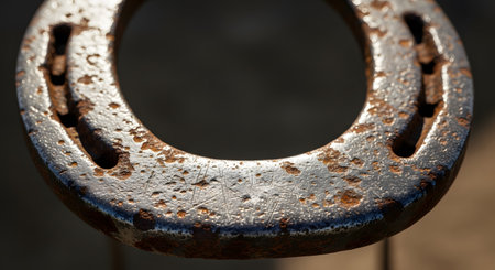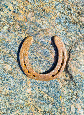 An old, rusty horseshoe rests on a weathered stone, a forgotten relic from a bygone era. Its corroded surface tells a story of time and tradition, representing a timeless symbol of luck, fortune, and enduring strength against the elements.