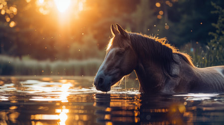 A horse stands in calm water as the sun sets, creating a serene scene with golden light, reflecting tranquility and nature.