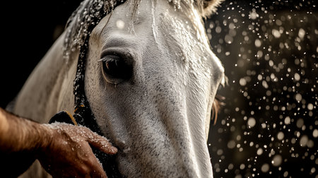 A close-up of a white horse being washed with water and soap in a darkened stable during a grooming session