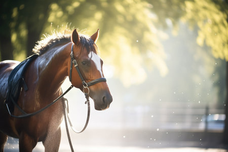 Thoroughbred stallion in bridle, focus on mane, outdoors on farm generated by artificial intelligence