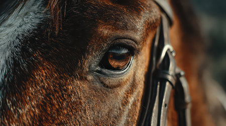 An intimate close-up view of a horse's eye in warm natural light, showcasing the intricate details of its fur and bridle, capturing a moment of peace and beauty.