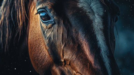 An intimate view capturing the horse's expressive eye and velvety coat, highlighting rich textures and soulful depth in a moment of quiet strength.