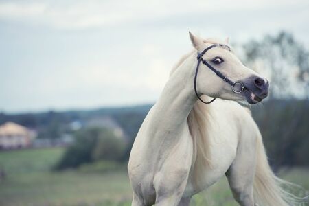 White horse with long mane portrait in motion. Spanish horse, andalusian