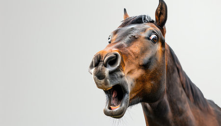 Lowangle view capturing the detailed expression of a horse with an open mouth against a blue sky background
