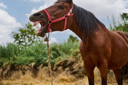 A horse stands in a sunlit grassy field wearing a red halter while yawning, showing its teeth. A fun and lively depiction of an animal in a natural outdoor setting.
