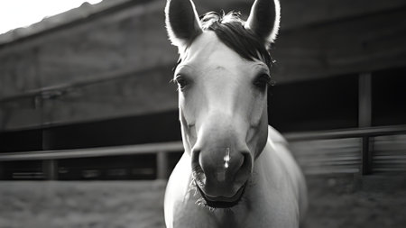 A striking black and white portrait of a horse, capturing its beauty and grace in a close-up shot. The details are amazing to see.