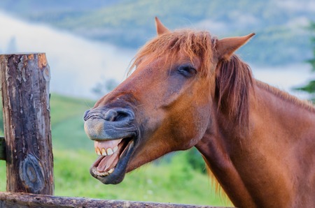 horse portrait. cute funny brown horse standing near fence on green meadow. rustic horse farm