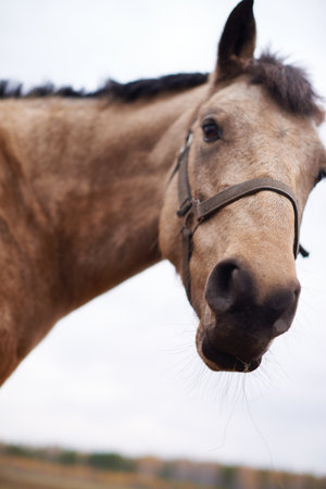 A black and white photo of a horse with a bridle on its muzzle. Equestrian sports and horse riding. Equestrian life.