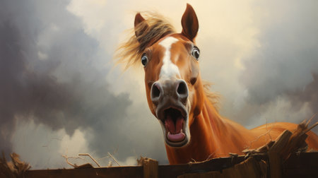 a horse peers curiously through a fence screen, showcasing a playful caricature style. the hyper-realistic representation captures the joyful chaos of the moment, enhanced by the dramatic skies. the dark orange and white hues add depth to the strong facial expression, while playful expressions further enliven the scene. ai generated