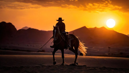 Cowboy riding a horse in the desert with sunset in the background