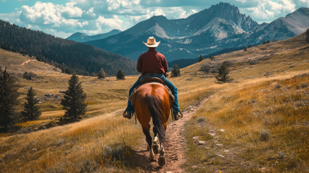 A man rides a horse along a winding path through stunning mountain scenery. The lush greenery and blue sky create a serene atmosphere perfect for outdoor lovers.