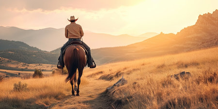 A dramatic, sunlit portrait of a rugged man on horseback, silhouetted against a golden sunset. Captures the essence of adventure, freedom, and western lifestyle in a beautiful, cinematic outdoor setting.
