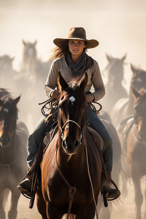 Cattle drivers. A young serious woman in a cowboy hat while driving a herd of horses. Portrait of a woman on a horse. Hard work on the dusty prairies. Vertical photo.