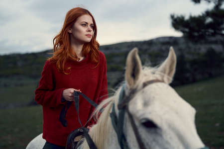 Beautiful young woman in the mountains riding her horse, nature.
