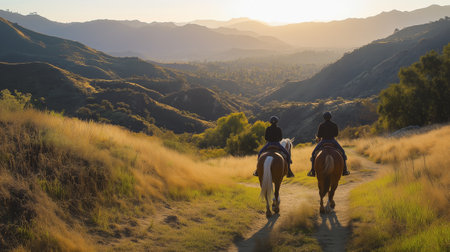 Horseback riders enjoy a sunset stroll through rolling hills in a scenic valley