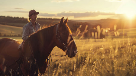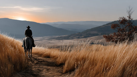 A tranquil scene featuring a cowboy on horseback amidst tall golden grass, overlooking a stunning landscape at sunset, capturing the essence of nature.