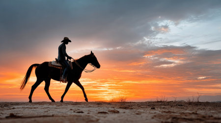 A striking silhouette of a lone cowboy riding a horse during sunset, showcasing vibrant colors and the tranquil beauty of nature's landscape.