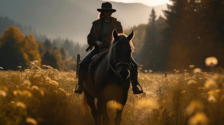 The picture of the cowboy or horse trainer with the horse that has been surrounded with wild nature under the sun at the dawn or dusk time, horse trainer require handling skills and technique. AIG43.