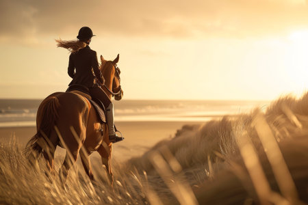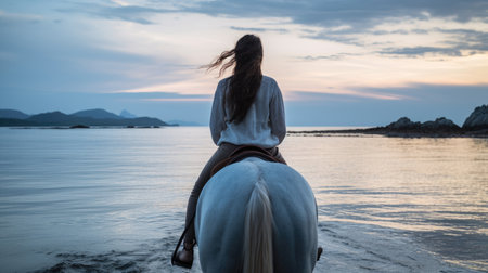 horseback expedition: A woman explores the wonders of nature, riding along the lakeside, surrounded by scenic beauty and a sense of tranquility. AI generated.
