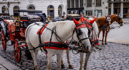 VIENNA, AUSTRIA, NOVEMBER 16, 2013: Horses with carriages and carts waiting for tourists in the old city streets.