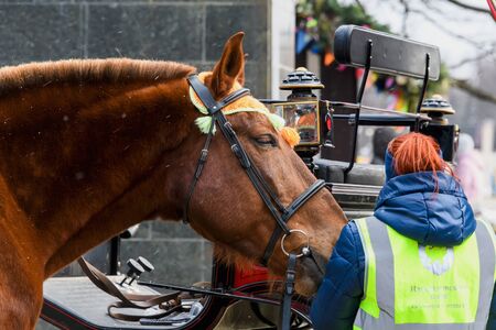Moscow, Russia, February 2020. A horse and a guide are waiting for customers in the Park. Horse riding.