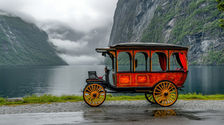 A vintage horse-drawn carriage sits beside a tranquil lake surrounded by misty mountains and lush greenery, evoking a sense of nostalgia and peace.