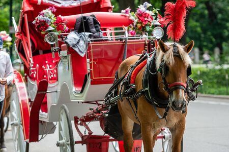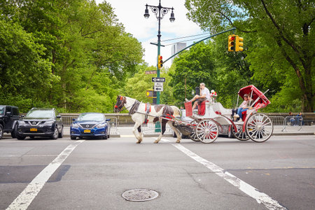 New York City, USA - May 26, 2017: Horse drawn carriage ride by the Central Park. It is one of the best ways for tourists to enjoy the beauty of the park.