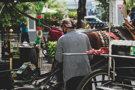 Rear view of a wagon or Andong driver on Jalan Malioboro, Yogyakarta. With typical Javanese batik clothes and blangkon hats.
