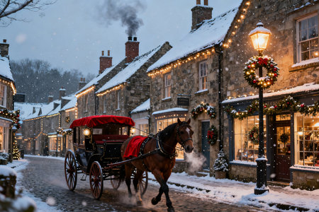 Horse-drawn carriages in the snow during Christmas time.