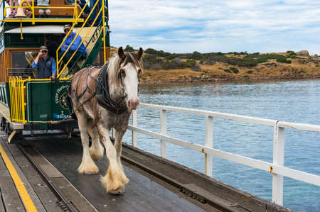 Victor Harbor, Australia - November 11, 2017: Horse Drawn Tram on the way to Granite island