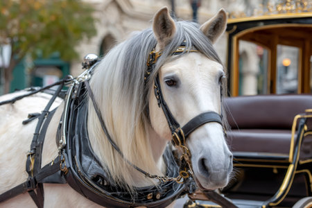 White horse wearing a harness while standing in front of an ornamental carriage