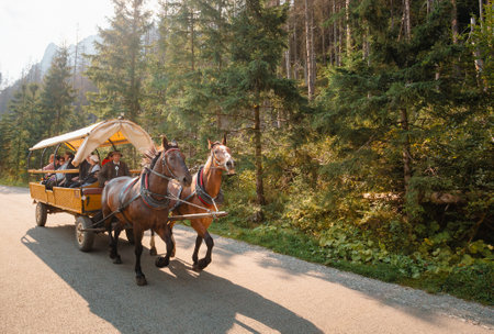 Tatra National Park, Poland. Man In National Traditional Polish Folk Ethnic Costumes Ride A Cart Harnessed By A Pair Of Horses Along A Mountain Road